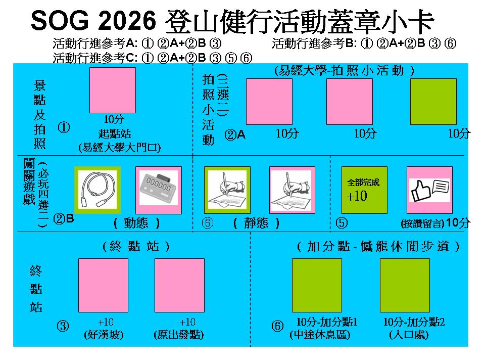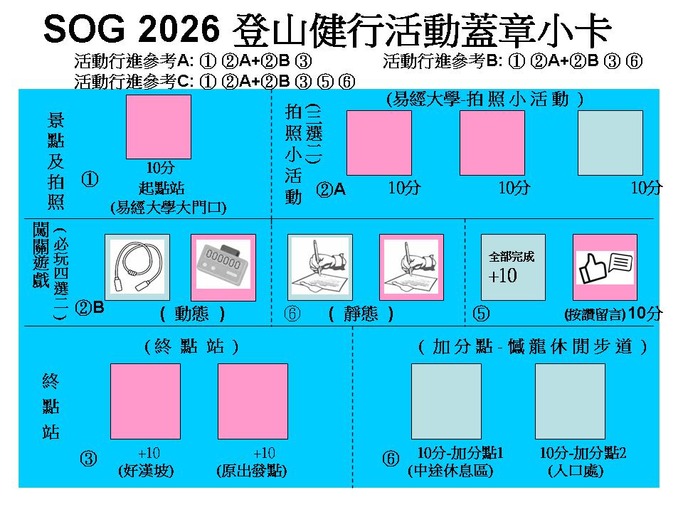 115年度-易 經 大 學 健 行 路 線 『 撼龍步道 & 趣味闖關活動-親友逗陣行 』 日期: 2026/03/28 (六) 路線: 集合 & 大合照 → 起點易經大學 → 易經大學各項☆動、靜態☆小活動 → 好漢坡(共143階) → 加分點撼龍休閒步道入口終點 ※公司本廠至集合點-路程約 5 分鐘。 (必玩闖關趣味小遊戲,平面路段及撼龍步道上下坡及好漢坡,全程約2.5~3公里,步行及活動約75~90分鐘)