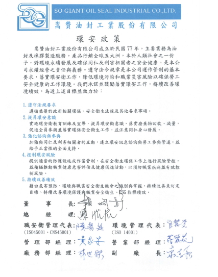 嵩贊油封工業股份有限公司成立於民國77年,主要業務為油封及橡膠製造服務。產品行銷全球五大洲,本於人類社會之一份子,對環境永續發展及確保同仁及利害相關者之安全健康,是本公司永續經營之責任與義務。遵守法令規章是本公司運作管制的基本要求,落實環安衛工作,降低環境污染和職業災害風險以確保勞工安全健康的工作環境。我們承諾並鼓勵落實環安工作,持續改善環境績效,為達上述目標並致力於: